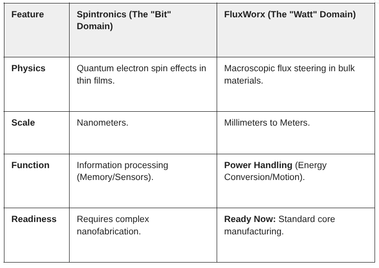 The Unification: Uniquely, the FluxWorx principle scales down as well. The ability to operate in a "few-gauss" mode means this same "transistor" behavior can be used for radiation-hardened, on-chip magnetic logic. It bridges the gap: capable of acting as a logic gate on a chip and a drive valve in a megawatt motor.